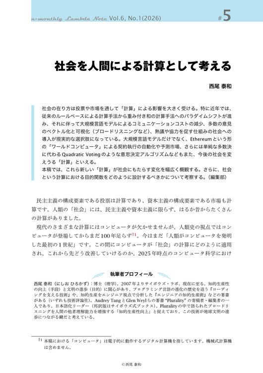 社会の在り方は投票や市場を通して「計算」による影響を大きく受ける。特に近年では、従来のルールベースによる計算手法から重み付き和の計算手法へのパラダイムシフトが進み、それに伴って大規模言語モデルによるコミュニケーションコストの減少、多数の意見のベクトル化と可視化(ブロードリスニングなど)、熟議や協力を促す仕組みの社会への導入が現実的な選択肢になっている。大規模言語モデルだけでなく、Ethereumという形の「ワールドコンピュータ」による契約執行の自動化や予測市場、さらには単純な多数決に代わるQuadratic Votingのような意思決定アルゴリズムなどもまた、今後の社会を変えうる「計算」といえる。